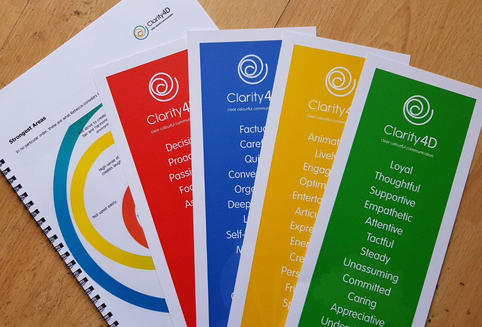 Clarity4D is an affordable, easy-to-use personal profiling tool, based on the work of Carl Jung. Completion of a simple online questionnaire generates a personal profile that uses colour to display your preferred behaviours and communication style.